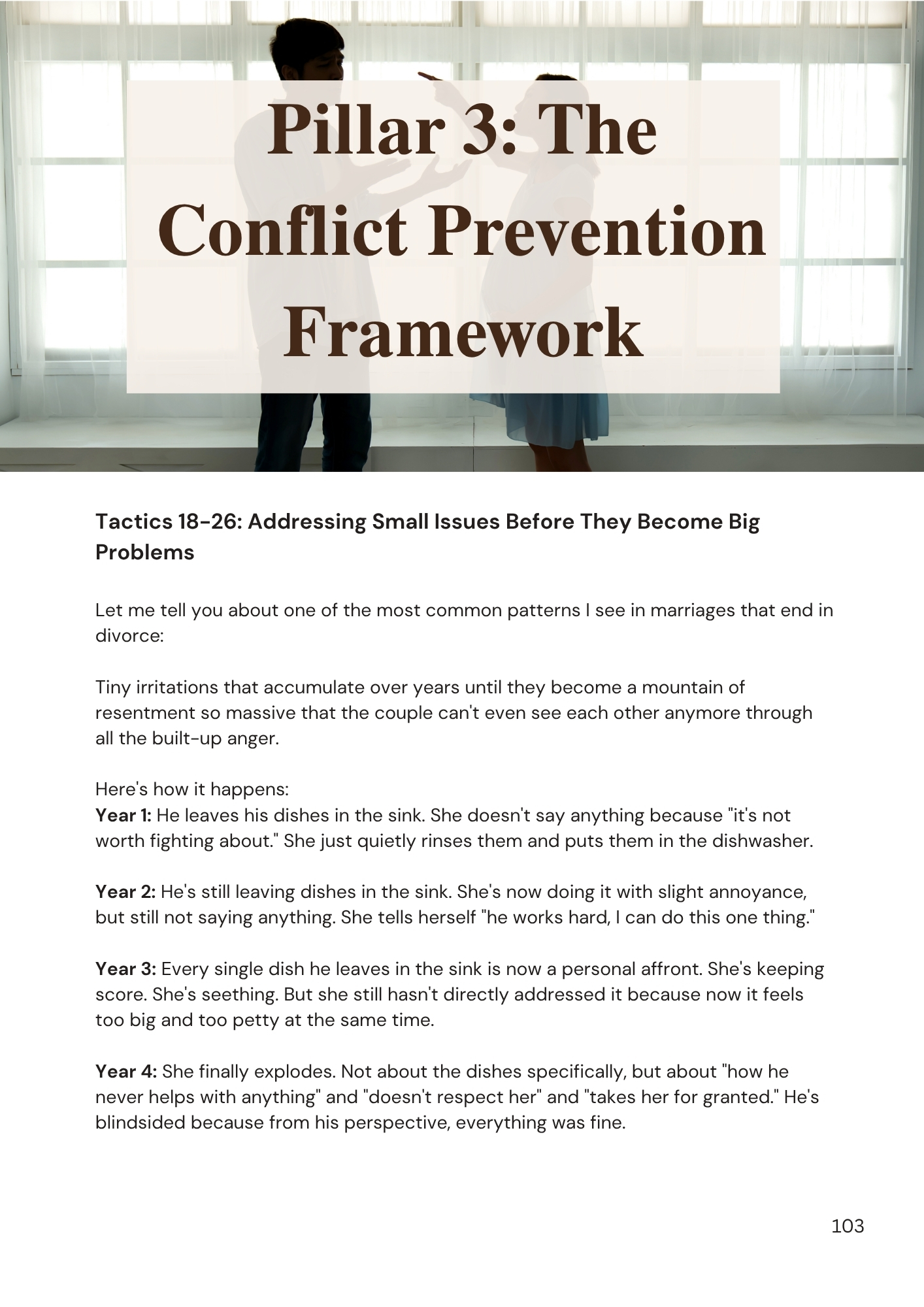 Addressing small issues before they become resentment through simple preventive systems (catching problems when they're still molehills, not mountains)