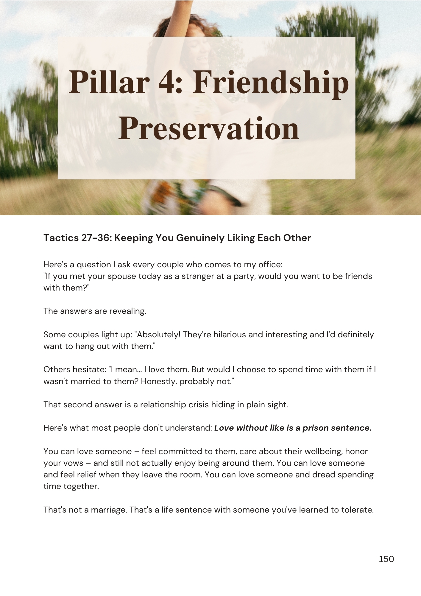 Regular meaningful conversations where you actually talk about real things, not just logistics (the kind of emotional intimacy that makes you feel like best friends, not just spouses)